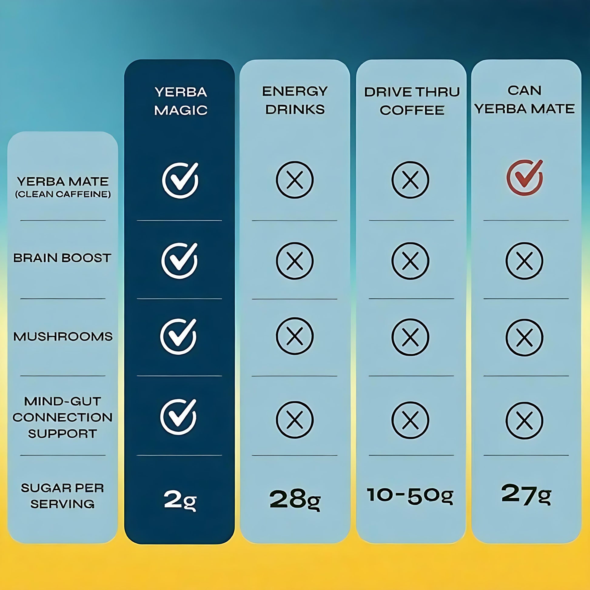 Each serving contains 100mg of natural caffeine from Yerba Mate, providing a steady energy boost without the jitters or crashes of coffee.